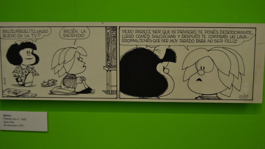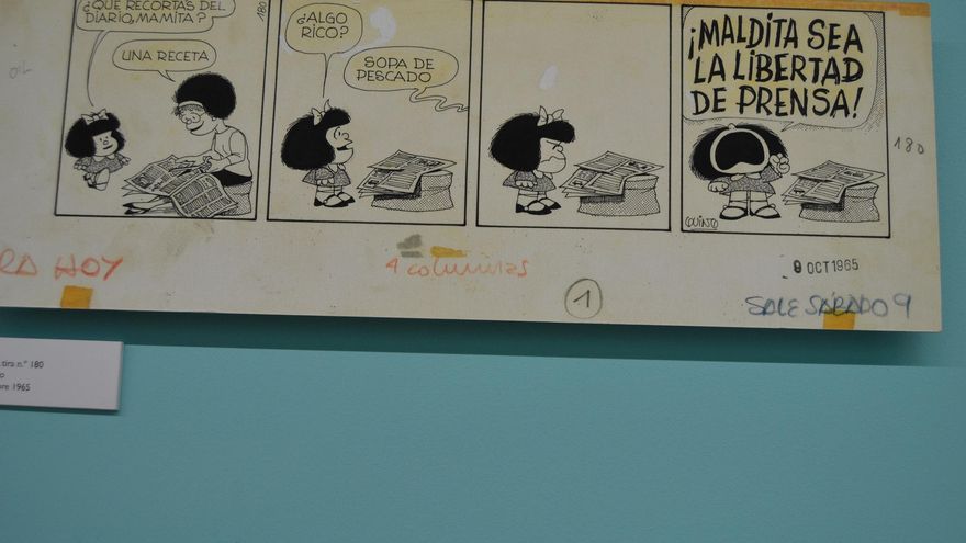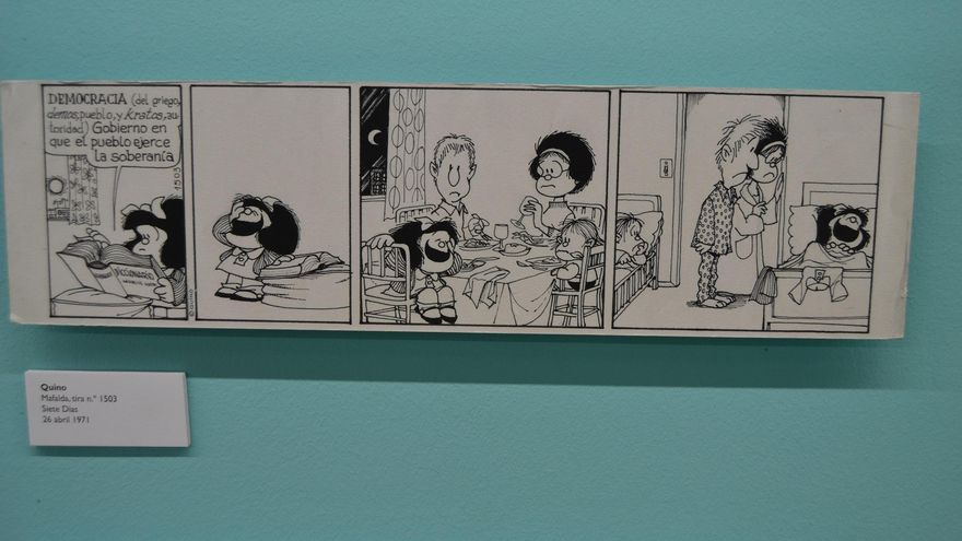 En la cocina hay sopa, mal que pese. “El odio de Mafalda hacia la sopa es una alegoría. La sopa es algo que por obligación tiene uno que engullir cada día en contra de su propia voluntad, de la misma forma que sufrimos la opresión. Los argentinos entendían muy bien ese tipo de alusiones”, explica Quino en uno de los textos que acompañan la exposición.