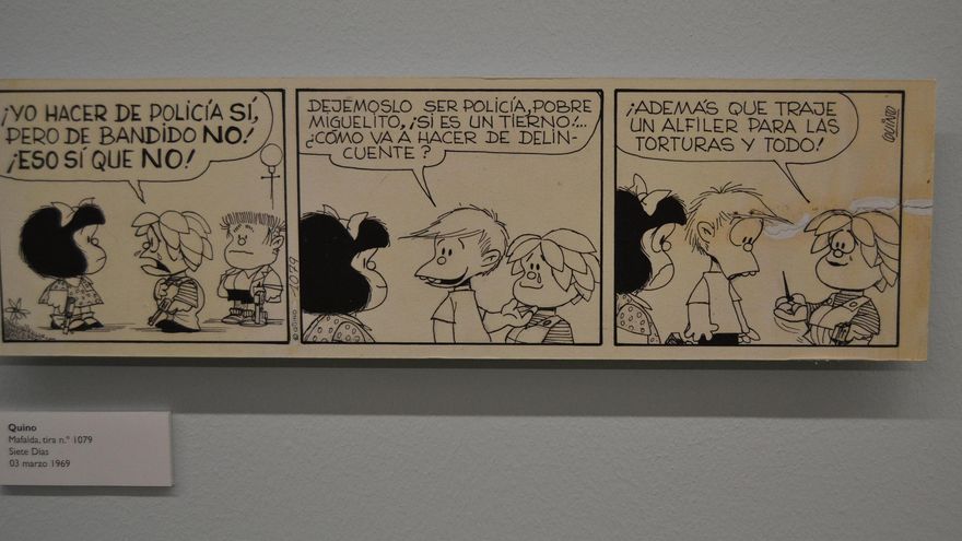 “Los niños representan a través del registro de la comedia lo que les sucede a los mayores en el de la tragedia”. Esta es una cita de Tomás Eloy Martínez y con ella se abre la exposición que La Térmica de Málaga dedica a Mafalda, niña en la tragedia de la dictadura argentina. Quino (Joaquín Lavado Tejón, 1932) la dibujó por primera vez hace 50 años, pero Mafalda sigue siendo la niña que con sus preguntas demuestra que cargamos con la tragedia. En el libro de agradecimientos, atiborrado de muestras de solidaridad con los dibujantes de Charlie Hebdo, alguien escribió que lo mejor de Mafalda es que nunca creció. Digamos, entonces, que el calendario se equivoca y que Mafalda sigue teniendo seis años. Martínez, periodista y escritor argentino exiliado por las amenazas de la Triple A, sabía de lo que hablaba. Su mensaje vale tanto hoy como valía ayer. Con risas se dice mejor.