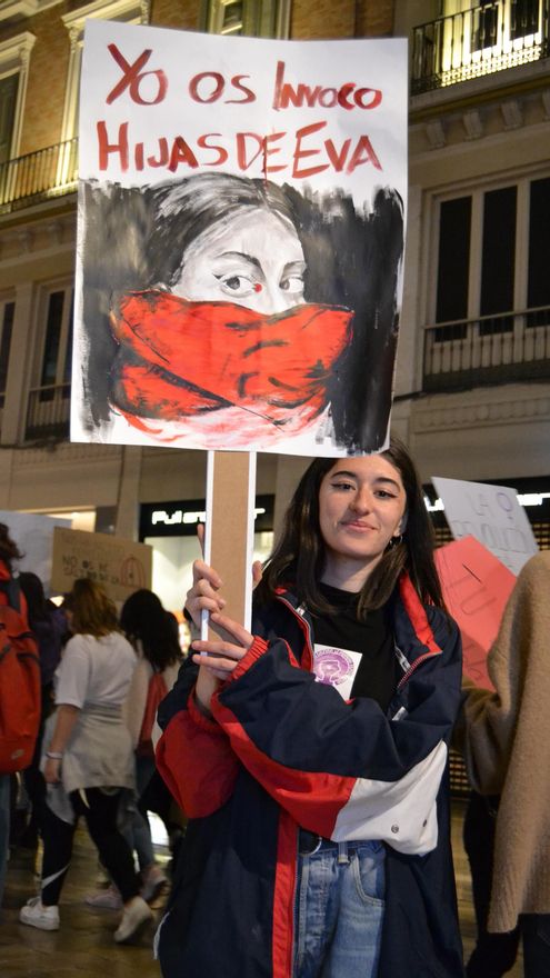 Pepe (69) y Paqui (64) también han venido con su hija, Esther (30), que a su vez está con su pareja. Paqui luce un vistoso pelo violeta, y dice que no es por la protesta, sino que siempre lo lleva así. Son gente luchadora, dice Pepe, que los lunes no falta a la protesta de los jubilados ante el ayuntamiento de Málaga. “Yo las animo a que peleen”, dice. Esther ha observado un repunte del machismo en los últimos tiempos, y como Paqui, cree que hay una amenaza de retroceso si no se ofrece resistencia.