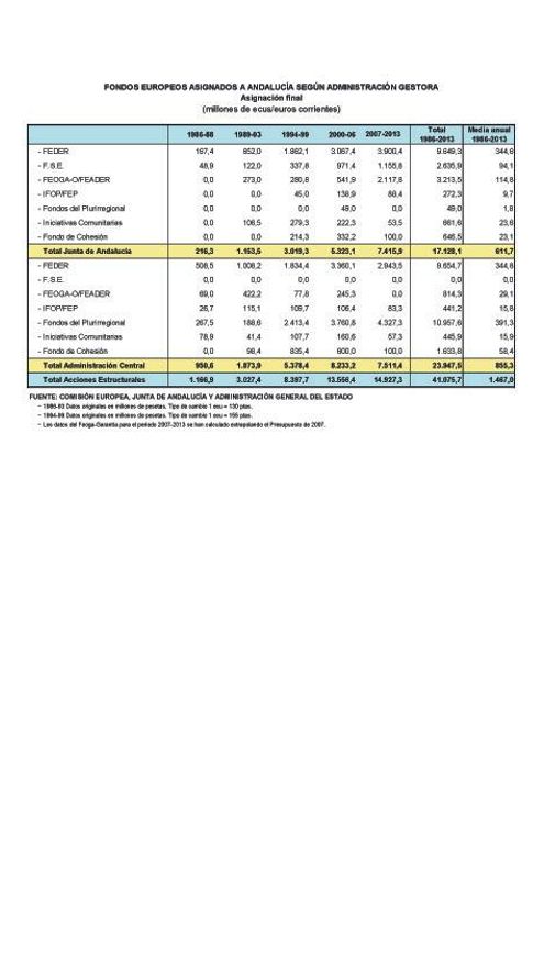 Las próximas elecciones europeas, históricamente marcadas por la abstención, obligan a mirar a la UE y ver qué ha supuesto para Andalucía. Se puede abordar desde muchos puntos de vista, pero el económico es el que deja menos lugar a la interpretación: la incorporación de España a la UE ha permitido que lleguen a Andalucía más de 40.000 millones de euros entre 1986 y 2013. La importancia cuantitativa de estos fondos no es determinante porque sólo han supuesto el 1,8% del PIB (producto interior bruto), pero sí han sido fundamentales para impulsar, desde el punto de vista cualitativo, la programación de las inversiones públicas.