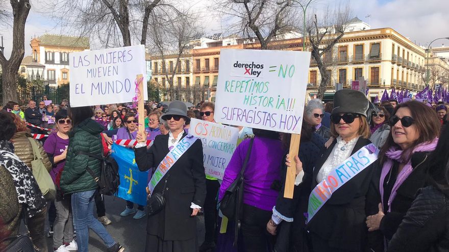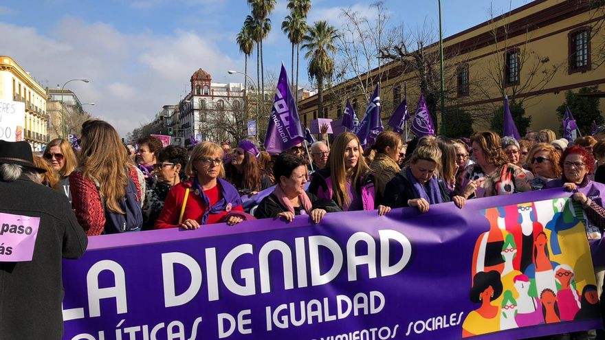 Más de 150 asociaciones de mujeres y 5.000 inscritas previamente, a las que se ha sumado más durante la mañana, han llenado de violeta las principales calles del centro de Sevilla, bajo el nombre de 'Tren de la dignidad' y con el lema 'Ni un paso atrás', desde la Avenida Menéndez Pelayo, pasando por Jardines de Murillo hasta llegar al Palacio de San Telmo, sede del Gobierno andaluz.
