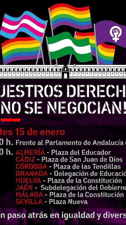 “Porque con nuestros derechos no se negocia, el próximo 15 de enero las personas LGTBI nos manifestaremos junto al movimiento feminista #NiunpasoatrásenIgualdad #NiunpasoatrásenDiversidad #NiUnPasoAtrás”, han escrito y difundido por las redes sociales diversas organizaciones, colectivos y asociaciones LGTBI como Andalucía Diversidad o la federación Plataforma Orgullo LGTBI Andalucía.