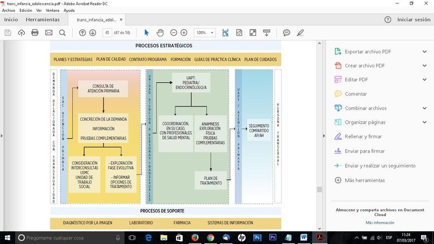 El PAI dice que “la atención en los menores de 14 años la realizarán los pediatras endocrinos de las unidades asignadas”. Por lo general, el PAI de la infancia y adolescencia está previsto para “personas menores de 18 años, o sus tutores en los menores de 16 años, que solicitan atención sanitaria relacionada con la transexualidad”. La atención finalizará “cuando la persona, o sus tutores en los menores de 16 años decide no continuar con la atención sanitaria relacionada con transexualidad” o en “personas que están recibiendo atención sanitaria relacionada con transexualidad durante la adolescencia y cumplen 18 años”, en que se produce la transición a PAI de en Personas Transexuales Adultas.
