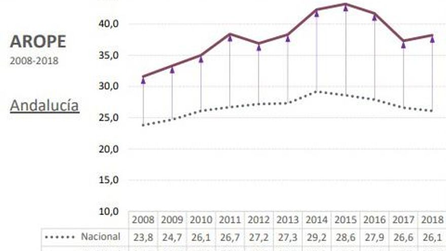 El incremento de Andalucía en la tasa Arope se debe al empeoramiento de la situación de las mujeres, cuya tasa crece casi dos puntos porcentuales mientras que la masculina se mantiene estable. Andalucía es una de las protagonistas en el más negativo de los sentidos, por arrojar los peores datos en múltiples parámetros de análisis a nivel nacional porque, aunque algunos de estos datos mejoren en su valor absoluto, en gran parte de los casos siguen situándola en los primeros puestos del ranking de las regiones españolas.