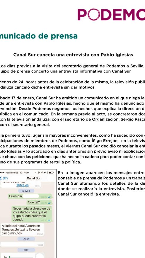Horas después de este comunicado, Podemos ha emitido otro, adjuntando una fotografía en la que se ven mensajes intercambiados supuestamente para la entrevista en cuestión. Éste es el escrito completo: