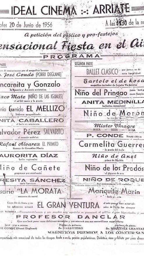 Todo lo empezó un cartel, que anuncia fecha y lugar de la “sensacional Fiesta en el Aire”: miércoles, 20 de junio de 1956 a las 11.30 de la noche, en el Ideal Cinema de Arriate (Málaga). Al cante y baile, entre otros, José Conde (Porri Deglané), Encarnita y Gonzalo (“la Rosario y Antonio arriateños”), Antonio Garrido El Mellizo (“Palanca Personificado”), o Bartolo el de Rosa (“magnífico imitador de Juanito Valderrama”). Paisanos de Arriate que actuaron en aquella edición de 1956.