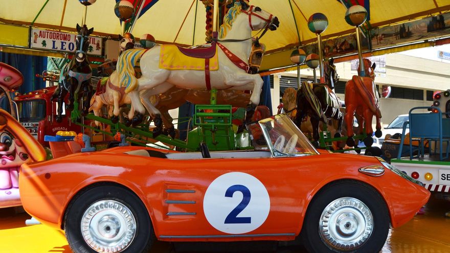‘El tiovivo de Triana’, ‘las calesitas del Tardón’, ‘los cacharritos de San Gonzalo’, ‘el tiovivo de las generaciones’… El Autódromo Infantil León tiene muchos nombres, pero una historia única e inconfundible. Situado en pleno corazón del barrio de Triana, en Sevilla, junto al mercado de San Gonzalo, por el singular carrusel han pasado “por lo menos cuatro generaciones”, rememora Luis León, hijo de su fundador y actual dueño, mientras saca brillo al bólido de carreras naranja.