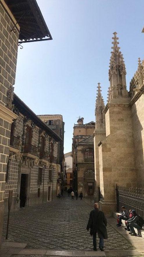Un consejo: Antes de cruzar la verja que separa la calle Oficios de la Gran Vía, de estilo neogótico y cuyo enclave original se encontraba en la plaza de acceso a la Capilla Real, hay que girar la cabeza (y elevar la mirada) y volver a disfrutar, ya a lo lejos, de cada uno de los edificios emblemáticos que descansan en ella. Una imagen con la que merece la pena quedarse. Y si es al caer la tarde, mejor que mejor.