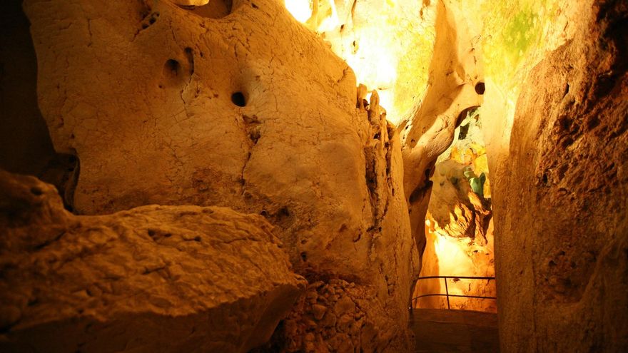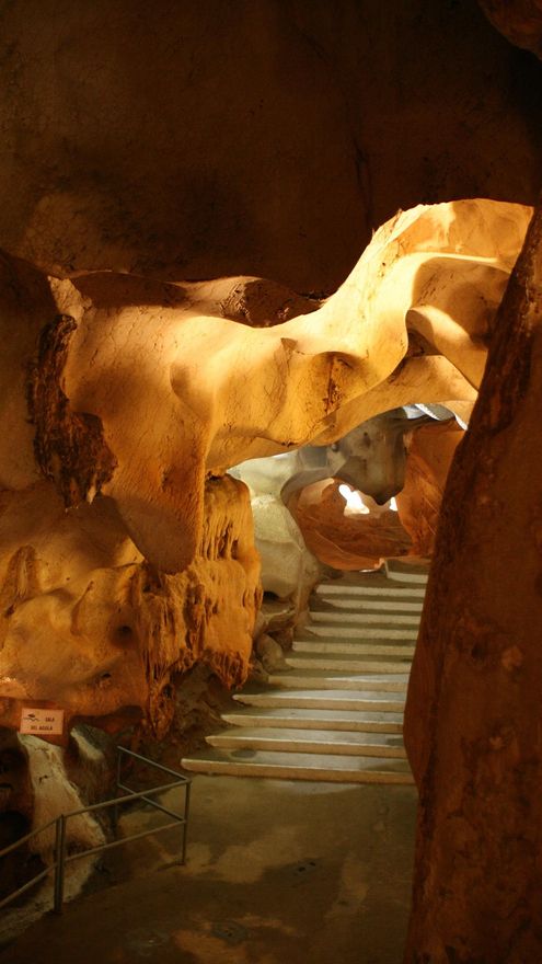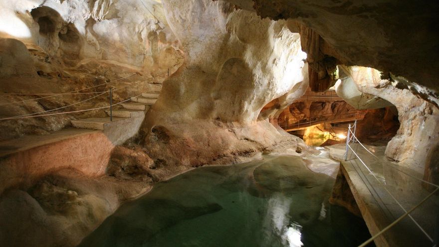 Piénsese en Gaudí, en las formas de la Casa Batlló intentadas por las olas del mar. Las paredes de la Cueva del Tesoro están horadadas por miles de años de agua y sal. Se formó durante el Jurásico, tiene una longitud total de 1.500 metros (la mayor parte de ellos no visitables) y entonces todo esto era mar. Algunas rocas están hoy mojadas, pero de agua de lluvia filtrada que tiñe de rojo suave las piedras más húmedas y se acumula en la Sala de los Tres Lagos. Ahora hay unos 800 metros hasta la orilla del Mediterráneo, pero Ana Galán explica que los espeleólogos creen que la gruta comunica directamente con el mar. Ana es guía de la cueva desde hace 11 años.