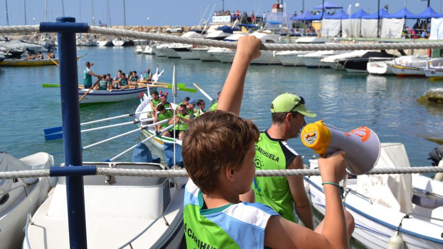 De repente, las barcas que antes estaban en línea empiezan a moverse. Se trata de llegar a una boya situada a 350 metros del punto de partida y volver. La tripulación de cada jábega son siete remeros, el patrón y el metebríos, que como su nombre indica es el encargado de arengar a los remeros, con el cuerpo inclinado hacia ellos como si fuera a comérselos.