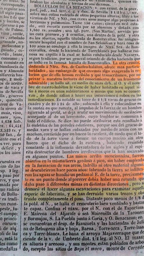 “Algo difícil de creer”, avisaba Madoz, aunque lo calificaba de “fenómeno admirable”. El texto, escrito en castellano antiguo, narra cómo “el nombre de cuatro-habitan le viene de haber habitado en aquel sitio 4 moros en unos subterráneos o minas que aún se conservan”. Y, atención, “de donde salían á hacer sus incursiones o robos en las inmediaciones”. De ahí la fábula del tesoro, sustentada en trazos de memoria colectiva.
