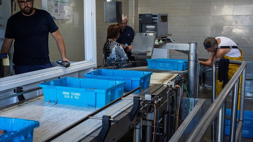 La lonja es un lugar de trabajo y negocio, pero también tiene algo de espectáculo. Aquí descargan 77 buques, así que por el suelo mojado desfilan pescadores recién regresados a tierra con el producto del mar, compradores a la busca de oportunidades y meros curiosos, cuya presencia está controlada desde hace unos años. “Lo restringimos porque es un correterío y por razones sanitarias y de seguridad”, razona Mari Carmen Navas, tercera generación de una saga de pescadores y patrona mayor de la Cofradía de Pescadores de Caleta de Vélez, que gestiona la lonja.