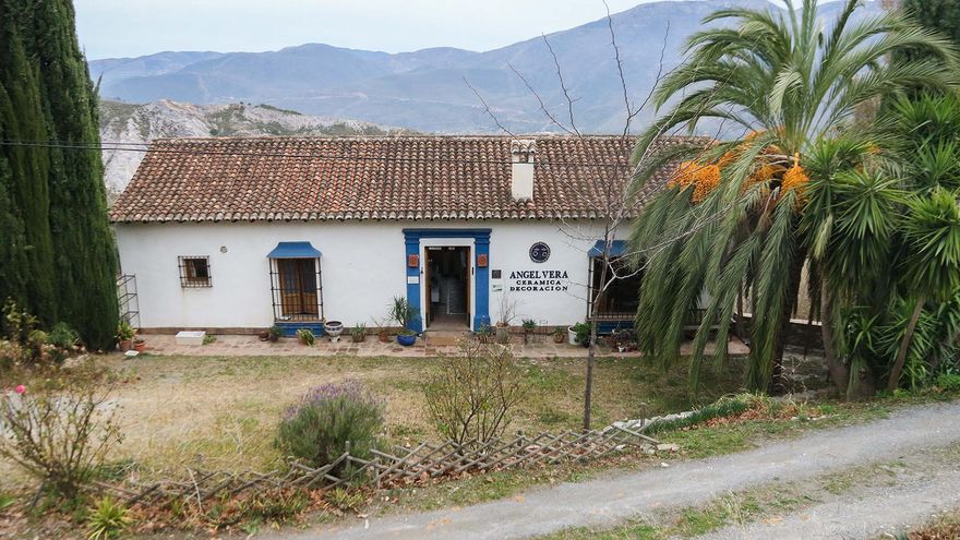 En esta vivienda reside, trabaja y se ubica su tienda, Ángel Vera Cerámica, a apenas unos metros de la carretera que se adentra en La Alpujarra. Allí empezó todo hace más de tres décadas y hoy el establecimiento es un reflejo de la trayectoria del artesano.