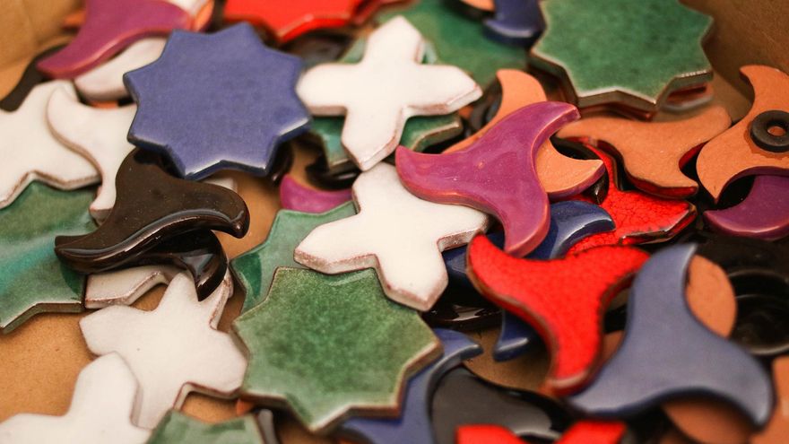 En multitud de bandejas se alinean cientos, miles de piezas en forma de arabescos. Tienen como destino las tiendas gestionadas en Granada por el Patronato de la Alhambra, donde se pueden comprar. Con mucho mimo y esmero, Vera las trabaja con paciencia infinita rodeado de esmaltes, productos químicos, espátulas, una prensa artesanal y dos brillantes naranjas del huerto frutal que aromatizan de cítricos el ambiente. También un magnífico horno, artífice del milagro de la cerámica.