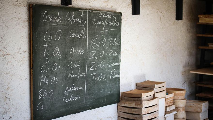 Todo se cuece, literalmente, unos escalones más abajo. Escondido entre olivos, el artesano dispone de un coqueto taller. Grandes ventanales iluminan una estancia estrecha y alargada donde el color del barro lo impregna todo. Hay escuadras y cartabones. Mandiles manchados de arcilla. Sobre la pared, en una pizarra, se leen diversas fórmulas químicas que el ceramista enseñó en alguno de los esporádicos cursos que ofrece.