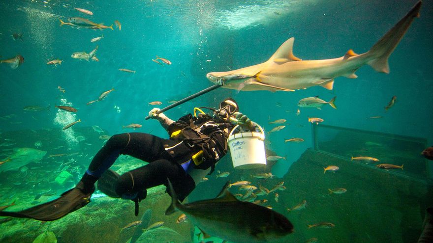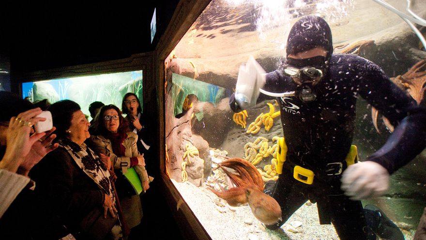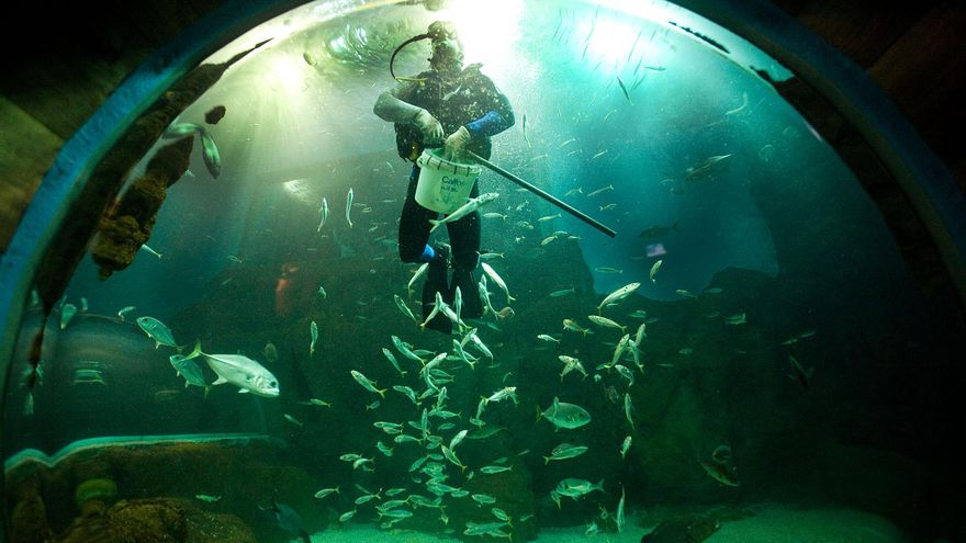 La limpieza y mantenimiento de las peceras corre a cargo de un equipo de buzos. Su actividad se convierte de inmediato en un nuevo entretenimiento para el visitante, que mira sorprendido al buzo rodeado de pulpos y otras especies marinas.