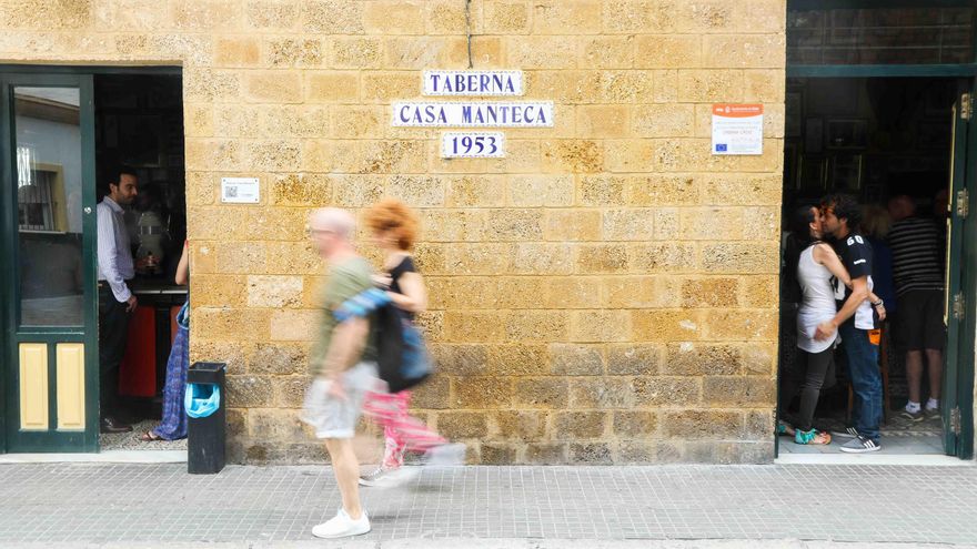Casa Manteca Cabezas de toro, carteles de corridas de Pedro Romero y Joselito Huertas. Los nombres de Curro Romero y Rafael de Paula. Y el de Sarkozy. Estampitas de la virgen y la foto de Camarón. La lista sería infinita... Porque su intensa decoración refleja que este local es otro santuario del buen comer. Y su alta afluencia cualquier día de la semana, tanto de vecinos del barrio como de turistas llegados de cualquier rincón, demuestra que su fama es mundial. Taberna Casa Manteca es otra de las leyendas gastronómicas gaditanas. Y eso que no tienen cocina.