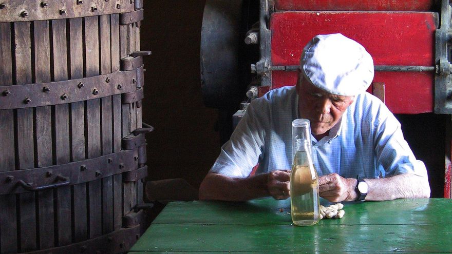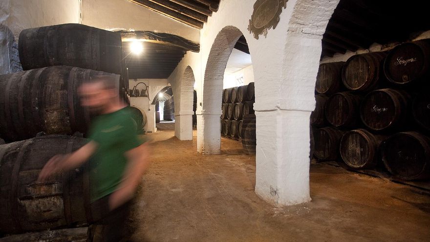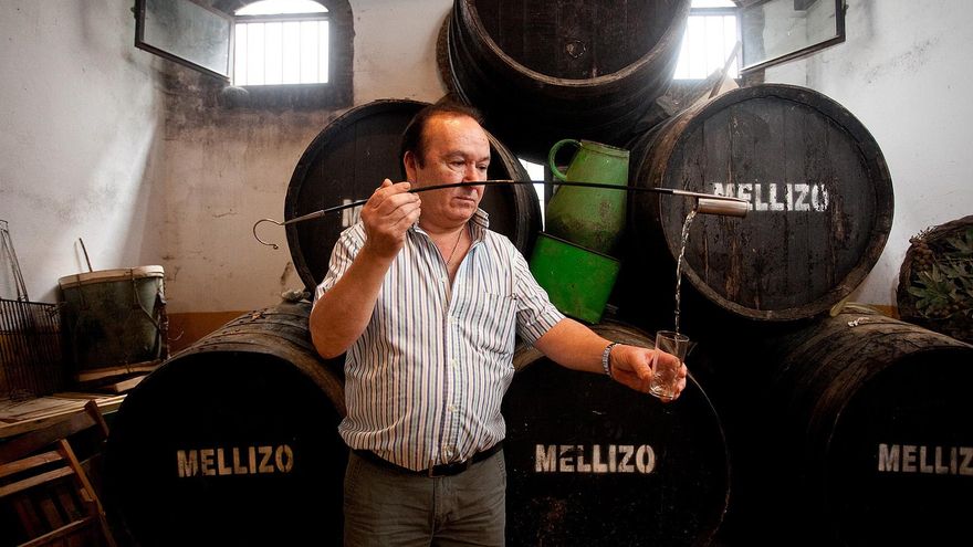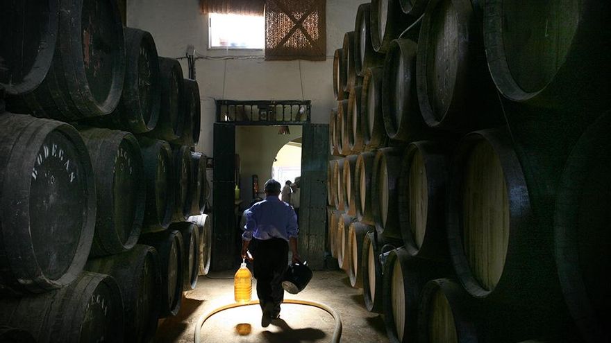 De padres a hijos, las bodegas y tabernas mantienen el legado de una tradición secular. Como en la taberna El Melli, de Villanueva. En la imagen Manuel Castillo decanta el mosto con la venencia. Conoce cada palmo de su bodega, nacida a principios de siglo. “Es de 1902”, afirma con orgullo. Y del interior de los bocoyes. La madera tiene memoria y la transmite cada año, a cada caldo. Desde hace unos años han recuperado una tradición: la pisada de la uva. “Estuvimos un tiempo sin pisar, pero llevamos cuatro años ya pisando, hemos vuelto a las raíces”. Todo un espectáculo, de finos matices antropológicos y etnológicos.
