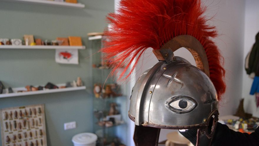En Arqueorutas hacen también actividades de recreación: en diciembre participaron en la programación del Teatro Romano preparando máscaras teatrales de cerámica y dentro de poco estarán en el Romanorum Festum de Casariche. Así que en una estantería tienen sus ropajes antiguos, las coronas de laurel y hasta cascos que, nos aclara Ortega, son del siglo IV.