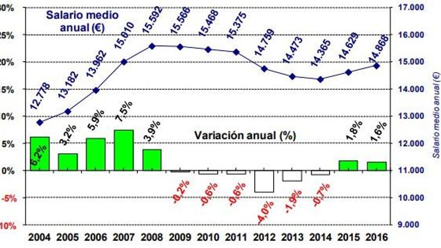 Según los datos contenido en el informe, fechado este mes de abril de 2018, el salario medio anual repuntó en 2016 con una subida del 1’6% en Andalucía hasta situarse en los 14.868 euros, cifra que continúa arrojando un descenso del 3’3% respecto a 2011 y del 4’6% respecto a 2008. Tras seis años acumulando caídas y tras el leve aumento del 1'8% registrado en 2015, el salario medio subió en Andalucía en 2016 para situarse en 14.868 euros anuales, lo que supone un aumento del 1’6% respecto a 2015. No obstante, el salario anual queda 507 euros por debajo del existente en 2011, antes de la última reforma laboral, y 724 euros anuales por debajo del techo de 15.592 alcanzado en 2008, lo que implica recortes del 3’3% y 4’6%, respectivamente.