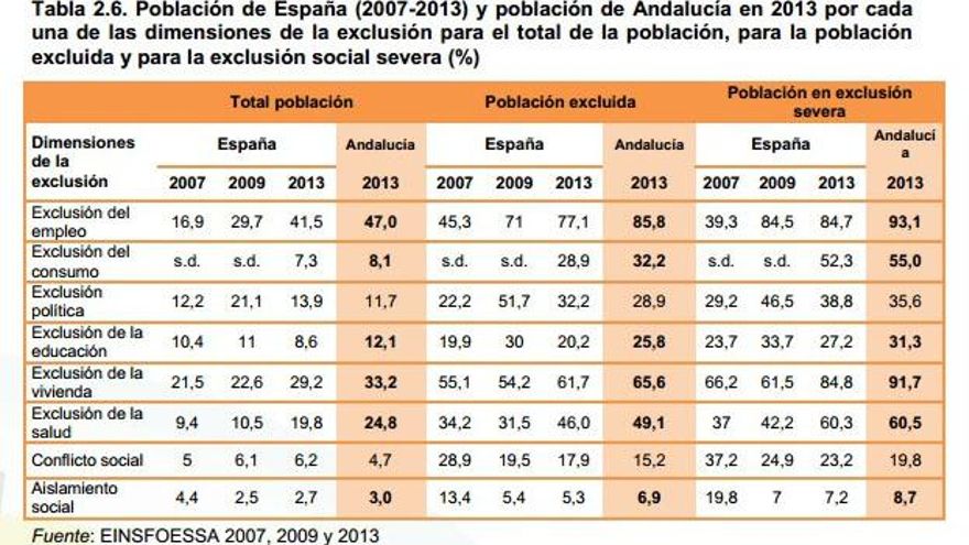En Andalucía, más de 2,1 millones de personas se ven afectadas por procesos de exclusión social, es decir, el 25,2% del total de la población de la región (más de 697.000 hogares). Dentro del espacio de la exclusión en Andalucía destaca ese millón de personas (el 52% del total de la exclusión) que se encuentran en la exclusión más severa. Por contra, el núcleo central de la sociedad andaluza considerada en integración plena es ya “una estricta minoría”.