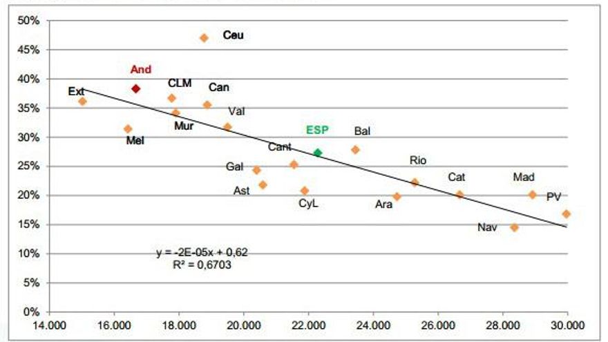 Una de las cuestiones que ha querido destacar en este sentido el técnico de Cáritas Guillermo Fernández es que Andalucía tiene una de las rentas más bajas y registra una tasa de pobreza y exclusión del 38,3%, la segunda más alta de España, aun cuando otras comunidades autónomas tienen niveles de renta inferiores o similares.