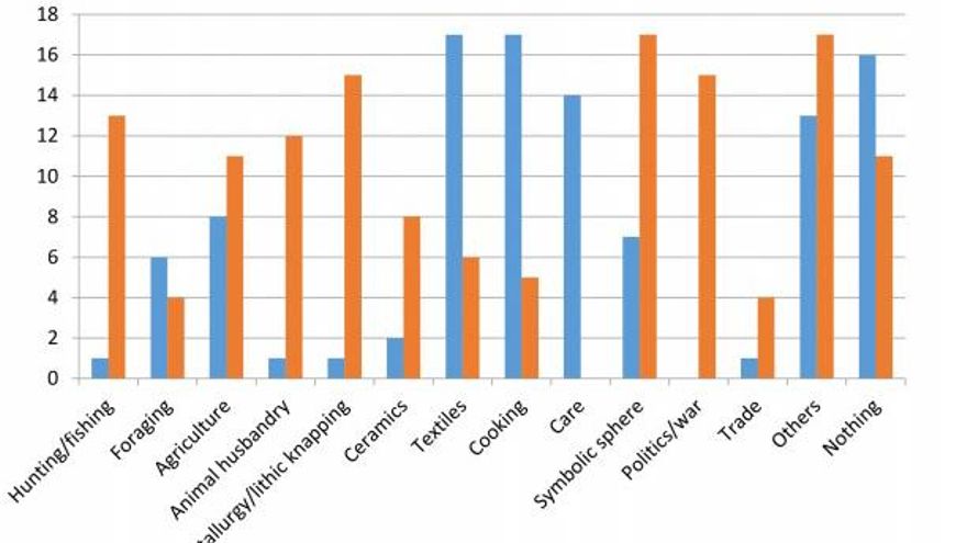 El estudio 'Género y Prehistoria. División sexual del trabajo en las producciones audiovisuales españolas' contabiliza el número de mujeres, hombres, niñas y niños que aparece en cada uno de los productos audiovisuales de difusión del patrimonio arqueológico y, al mismo tiempo, estudia las actividades que unos y otras realizan. En ese sentido, la representación de los hombres en la Prehistoria se asocia principalmente a tareas de agricultura, caza y pesca, metalurgia, política o guerra. Por su parte, a las mujeres se las vincula más con labores de cocina, elaboración de tejidos o cuidado de la familia.