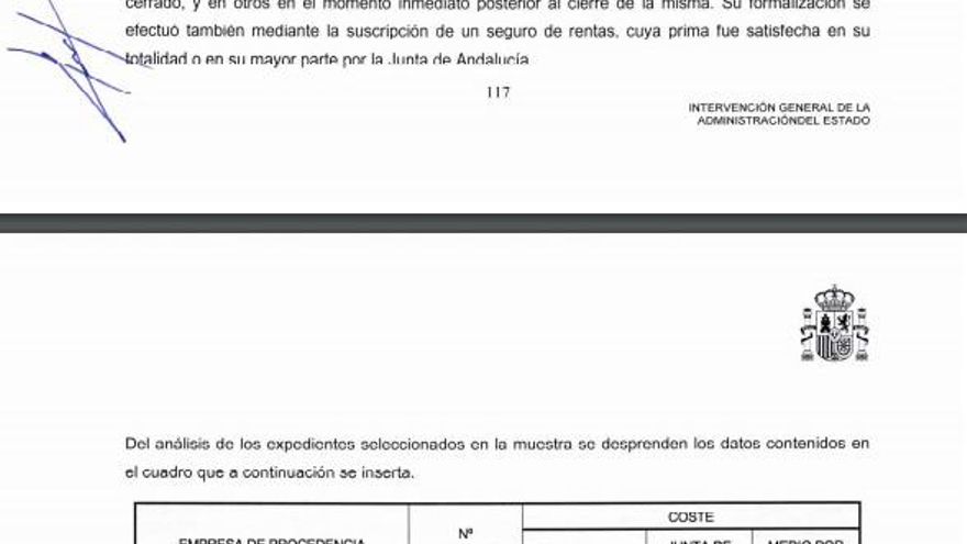 Como se puede apreciar en el siguiente extracto del informe de la IGAE, también se referían los peritos a 194,8 millones de la prima del seguro para los asegurados de dichas empresas, cuya formalización se efectuó “mediante la suscripción de un seguro de rentas cuya prima fue satisfecha en su totalidad o en su mayor parte por la Junta de Andalucía”. La práctica totalidad de esa cantidad se incluye en la Faja Pirítica, cofinanciada por el Gobierno central y la Junta y que es objeto de una investigación aparte en una de las decenas de piezas separadas por el Jugado de Instrucción número 6 de Sevilla.
