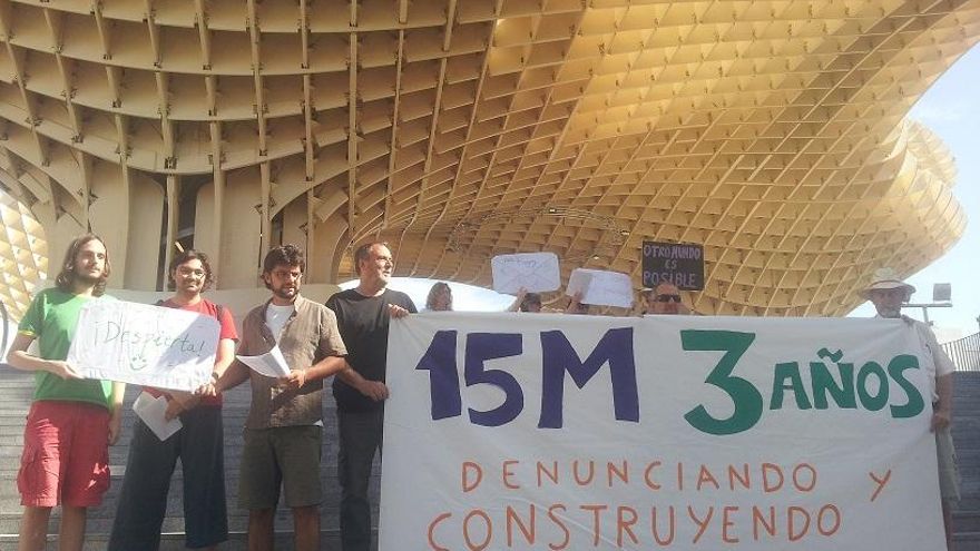 Los objetivos siguen siendo los mismos: “denunciar las políticas antisociales y defender los derechos de los de abajo frente a los abusos delictivos de los banqueros en connivencia con los políticos corruptos que nos vienen gobernando”. Así reza el manifiesto '15M, tres años denunciando y construyendo', a quien ha puesto voz Churi, de la palataforma 15M Montequinto, ha leído el manifiesto en las simbólicas 'Setas' de la Plaza de la Encarnación, donde hace casi tres años se centró la movilización en la capital hispalense: