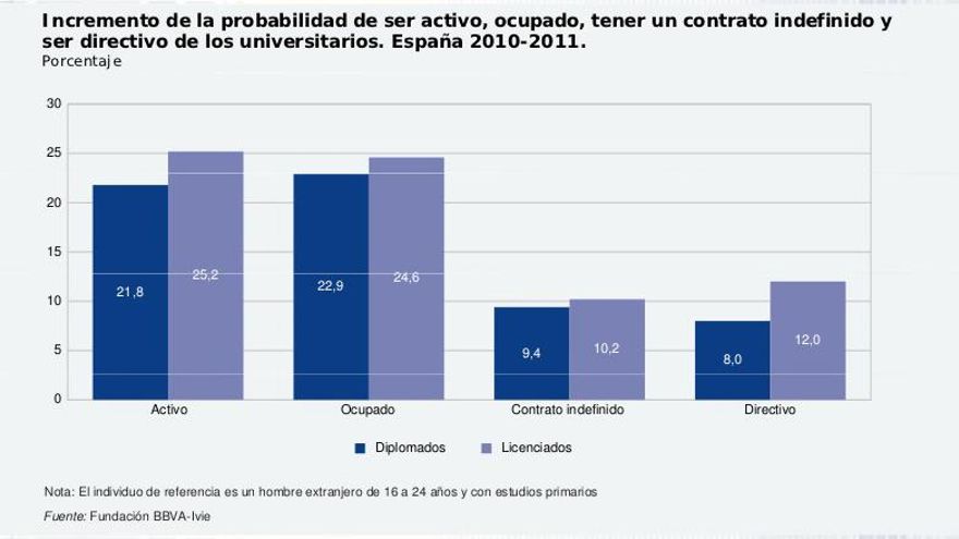 Tomando como referencia a un extranjero de entre 16 y 24 años con estudios primarios, el estudio concluye que las probabilidades de estar ocupado para un licenciado universitario aumentan un 25%, las de tener un contrato indefinido otro 10% y las de ocupar un puesto directivo un 12%.