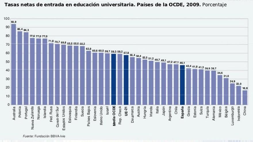 La tabla muestra que a pesar de ese gran crecimiento de licenciados universitarios, en España la tasa de entrada a la Universidad para los jóvenes de 18 años sigue siendo de las más bajas de los países desarrollados. Un 46%, frente al 58% de la media de la Unión Europea o el 60% de los países de la OCDE.