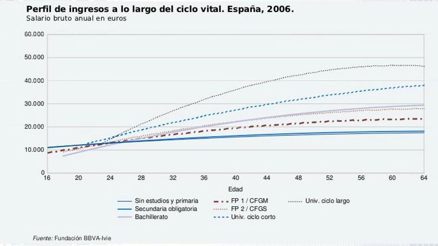 Como consecuencia, y aunque al inicio de la vida laboral las diferencias no sean tan aparentes, a lo largo de los años los graduados universitarios también disfrutan de una clara ventaja salarial. “No todos los titulados universitarios son mileuristas, ni lo son toda la vida”, concluye el estudio tras confirmar que sus ingresos crecen a lo largo de su vida laboral.