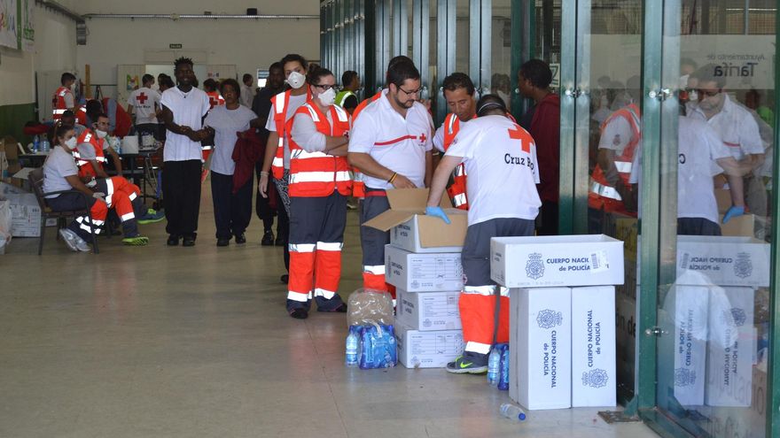 “Como esto, nunca”, zanja Miguel García, portavoz de Cruz Roja, que ha atendido a 1.219 personas llegadas en dos días: 307, el lunes, 912, el martes. La cifra casi iguala el número de personas atendidas por los equipos de respuesta inmediata durante todo el año 2013. “Cuando ocurre algo de esto el cuerpo te pide venir”, explica Laura de la Pascua, enfermera voluntaria de Cruz Roja en Cádiz. Tiene 22 años y el martes su teléfono sonó a las 8.30 de la mañana: “Te levantas, te vistes, desayunas corriendo y te vas”. A mediodía del jueves lleva acumuladas más de 15 horas trabajo seguidas, alguna de ellas consumida preparando biberones: “Cuando por la mañana los niños te miran y juguetean contigo, reconforta”. Su compañero Nordin Meskin es marroquí, lleva 27 años en España y es voluntario en Almería. El día 11 terminó de colaborar en la Operación Paso del Estrecho y se unió a los compañeros de Tarifa. Como habla francés y árabe, es uno de los encargados de ejercer labores de traductor, y tiene contacto directo con ellos: “Hay gente que lleva tres o cuatro años en Marruecos o que han cruzado casi toda África, y al llegar aquí sienten les ha llegado el momento. Y te abrazan”. Laura y Nordin son dos de los 52 voluntarios que Cruz Roja ha desplegado en Tarifa, distribuidos en los dos pabellones municipales. Muchos son de la provincia de Cádiz, pero han llegado también Granada, Málaga, Huelva, Sevilla o Almería. La mayoría no ha lidiado nunca con una situación parecida.