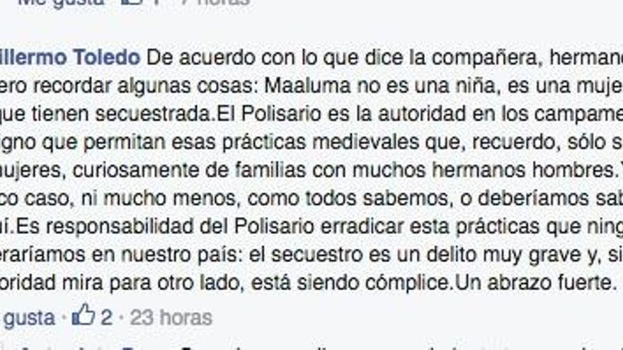 Toledo, que es conocido por su activa defensa de la independencia del pueblo saharaui, ha mantenido una agria disputa por redes sociales con otros miembros del movimiento prosaharaui. Aprovechando un 'post' en Facebook del activista Juanjo Miera, ha recordado que Maloma “no es una niña”, sino “una mujer adulta a la que tienen secuestrada”.
