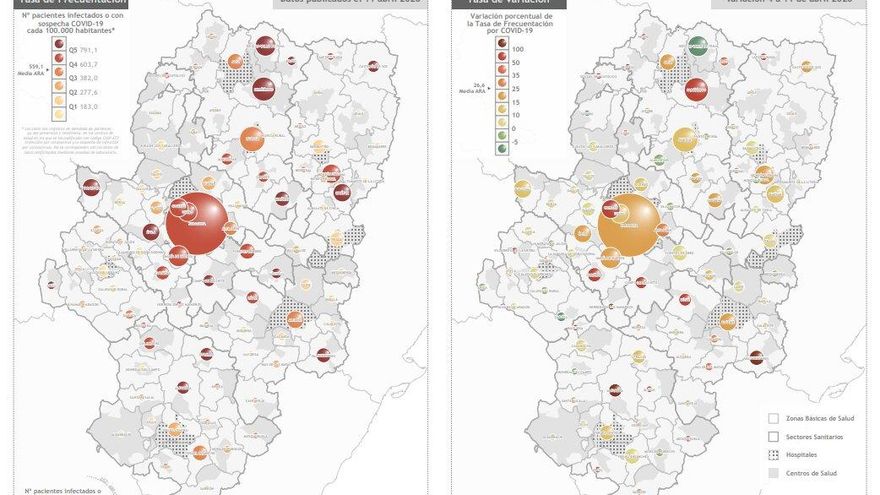 Las primeras cartografías muestran el número de pacientes infectados o con sospecha de estar infectados, según registro de los Centros de Salud, así como la Tasa de variación porcentual entre el 4 y el 11 de abril en Aragón. Estos son algunos de los datos obtenidos por el grupo de trabajo interdisciplinar de geógrafos, ingenieros, informáticos y con personal sanitario de Atención Primaria y de Hospitales, que desde hace varias semanas trabaja para poder poner a disposición de la sociedad mapas temáticos que permitan relacionar los datos de esta pandemia con la información sociodemográfica de interés.
