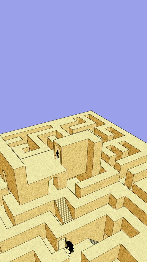 Para el laberinto del minotauro, Remacha opta por una forma “tridimensional”, con diferentes alturas, que lo aleja de la imagen extendida en el mundo del arte. Además, “el encuadre muestra los límites de la construcción, para dejar claro que están encerrados y que, aunque ellos no lo ven, tras las paredes está el mundo exterior”. El infierno que Dante describe en 'La divina comedia' toma forma de “un círculo no imposible, pero sí extraño en el mundo real”, recorrido por unas escaleras cuyo final no se atisba hacia abajo, pero que hacia arriba deja entrever la luz del cielo.