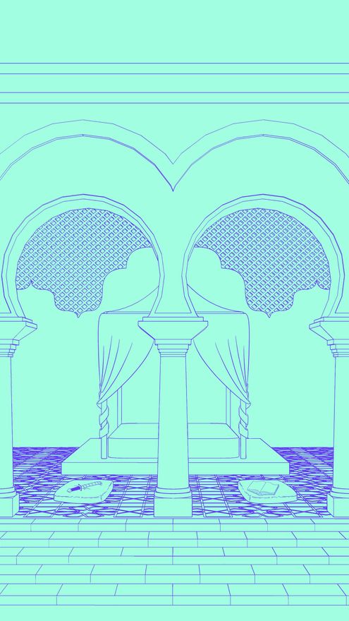“No quería dibujar los edificios tal cual aparecen descritos, sino crear una alegoría que explicara las ideas tras el libro”, cuenta Mik Remacha. Este ánimo se hace patente en la lámina dedicada a 'Las mil y una noches', donde recrea “la tensión” entre el sultán y Sherezade mediante un espacio simétrico de aires orientales que queda dividido por una columna: a un lado, un cojín con una daga representa al rey; al otro, un libro hace lo propio con la princesa; al fondo, un lecho sin una arruga marca que la historia continúa.