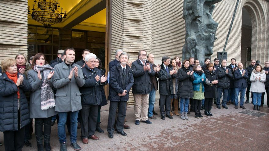 A las 12.00 horas, frente a la puerta del Ayuntamiento, el alcalde de Zaragoza, Pedro Santisteve, ha presidido este acto institucional arropado por el equipo de gobierno y los concejales de los grupos de la oposición, que ha concluido con un aplauso