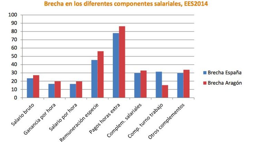 Según los datos de la encuesta de Estructura Salarial de 2014 (última disponible) la brecha salarial por género, es decir, la diferencia salarial entre hombres y mujeres en España es del 23 % en el salario bruto, frente al 27 % que supone la brecha aragonesa. El estudio manifiesta también que la brecha aumenta con la edad y con la antigüedad (en Aragón el grupo más castigado es el de los 40 a 49 años), con la jornada parcial (22 % en Aragón) y con el tipo de negociación (es menor cuando hay un convenido de empresa, frente a convenios sectoriales).