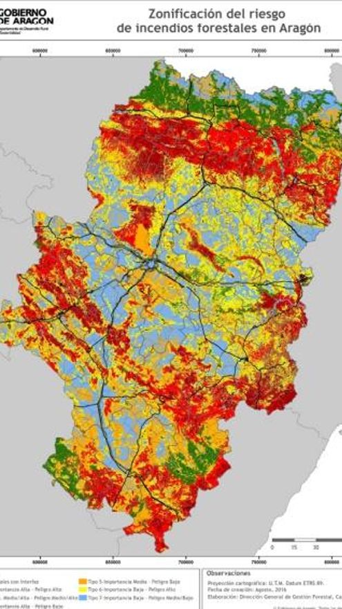 El Gobierno de Aragón ha catalogado más de la cuarta parte de la superficie de la comunidad, 12.705 kilómetros cuadrados de monte y de zonas agrarias aledañas, como zonas de riesgo alto o extremo de incendios. El grueso de esas superficies, otros 25.062 kilómetros cuadrados, se cataloga como áreas de riesgo medio, mientras que en otros 9.886 el peligro es bajo.