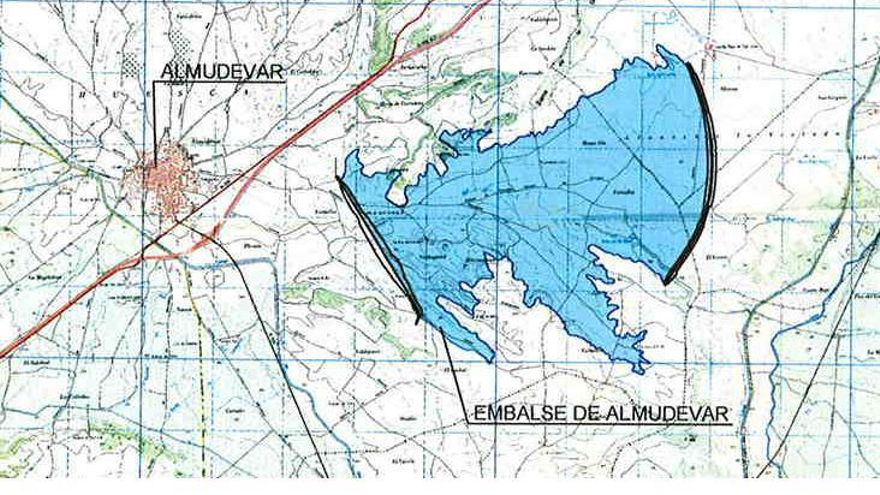 El proyecto para Almudévar, que implica asimismo los términos municipales de Huesca y Vicién, consta de 170 hectómetros cúbicos de capacidad, dos presas de 2.400 y 3.900 metros de largo, respectivamente, para una altura de 41,5 y 26 metros. Cierran una amplia vaguada en el municipio de Almudévar, una pequeña población de 2.500 habitantes situada a 14 kilómetros de la capital oscense y a unos 3,5 al norte de la confluencia de los canales de Monegros y del Cinca en Tardienta.