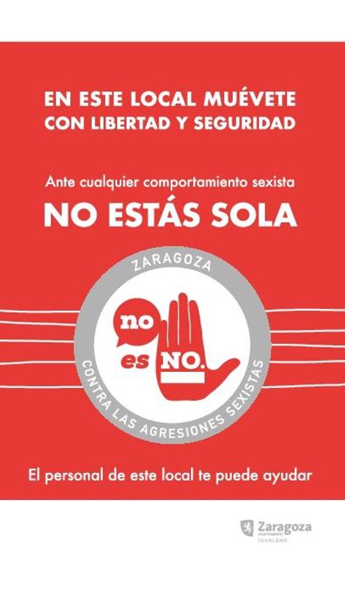 El Ayuntamiento de Zaragoza aplicará por primera vez en Nochevieja la campaña “No es No” contra las agresiones sexistas. Se da así continuidad a la iniciativa de las últimas Fiestas del Pilar, con la instalación de 'puntos seguros' en los cotillones de la Sala Multiusos del Auditorio, discoteca Supernova, Parque del Agua (Espacio Ebro y Pabellón de Ceremonias), y en la plaza del Pilar.
