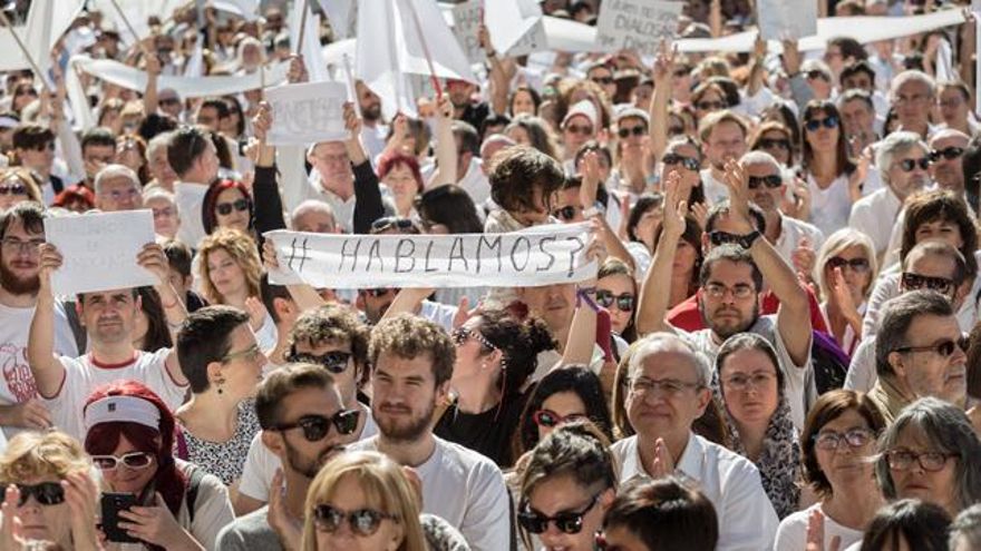 Mujeres, hombres, niños y niñas han mostrado una cara amable. Que pide diálogo y entendimiento. Que solo reclama política, como rezaba una pequeña pancarta en manos de un asistente. Porque esos han sido todos los mensajes, escuetos letreros alzados entre el blanco en los que se podía leer: “En mi ciudad no cabe el odio”, “La violencia es de cobardes” o “Quien no sepa dialogar que dimita”.