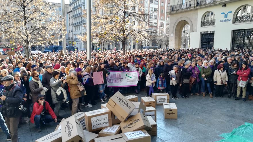 Por ellas, por cada una de ellas, más de mil mujeres y hombres (más de las primeras) se han unido este domingo en la plaza de España de Zaragoza, para después manifestarse hasta el Paraninfo. Una voz unánime, desgarrada, sincera y potente: “¡Contra la violencia machista, lucha feminista!”. Ese era el lema de la concentración convocada por la Coordinadora de Organizaciones Feministas de Zaragoza este domingo. “¡Justicia machista, respuesta feminista!”, rezaba el de 8M Zaragoza, también convocante.