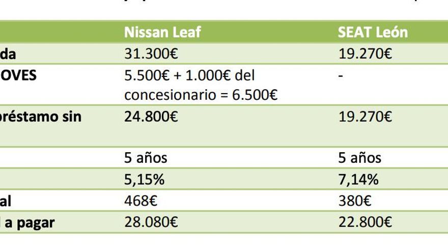 Comparativa De forma concreta, el informe compara dos modelos de gasolina y eléctrico: un Seat León (el auto más vendido en España de 2018) y un Nissan Leaf (el segundo eléctrico más comprado). Según las estimaciones HelpMyCash, después de aplicar todas las ayudas y beneficios de financiación, el vehículo eléctrico saldría por 28.080 € y el de gasolina por 22.800 €, lo que se traduciría en una cuota mensual de 468 € para el Nissan Leaf y un 380 € para el Seat León.