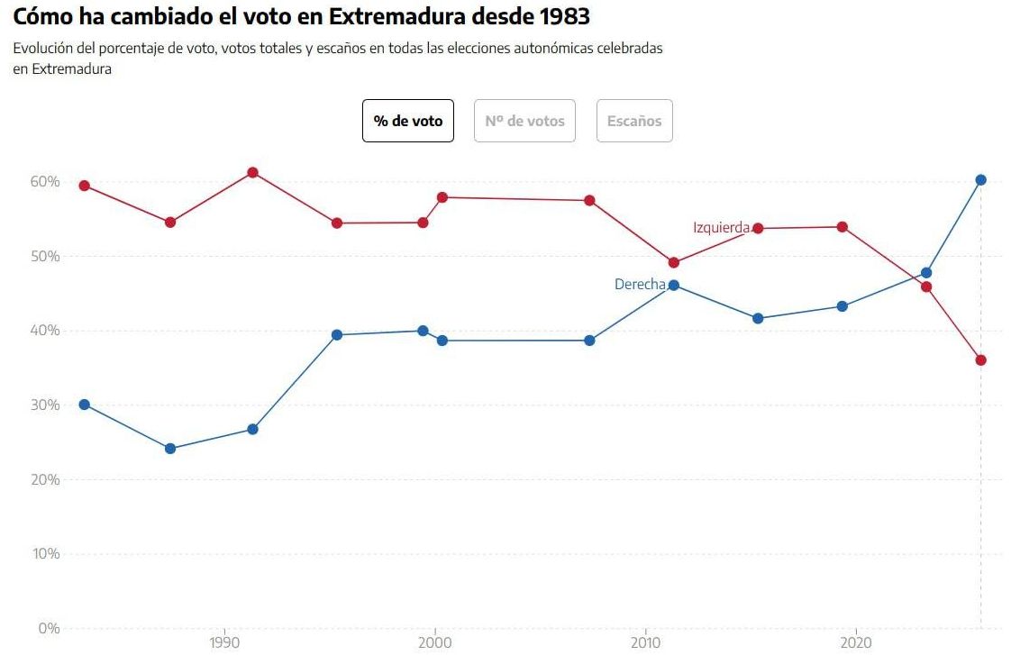 En el capítulo de ‘la izquierda ya se conforma con coger oxígeno y respirar’ tenemos a Unidas por Extremadura, la coalición de Podemos e Izquierda Unida en un territorio donde Sumar no existe. La debilidad del PSOE, una buena candidata y una buena campaña (milagro: sin insultos públicos entre ellos) han dado a Irene de Miguel 7 escaños, tres más de los que tenían. Al menos se rompe una tendencia.