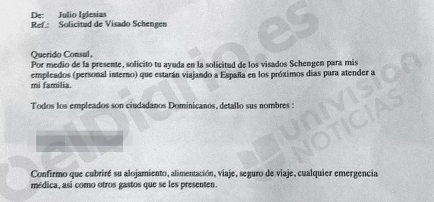 Hemos publicado una nueva entrega de la exclusiva de elDiario.es en colaboración con Univisión sobre Julio Iglesias. Para completar la radiografía del sistema laboral que operaba en las mansiones del cantante, y que da contexto a los testimonios que denuncian agresiones sexuales, contamos que Julio Iglesias trasladó a España a varias de sus empleadas de República Dominicana con un visado de turista, sin contrato y con sueldos de 340 euros al mes. Las condiciones de trabajo que confirman tres mujeres que fueron trasladadas a la casa del cantante en Marbella son contrarias a la normativa española: sin contrato ni Seguridad Social, con jornadas de más de 12 horas y sin posibilidad apenas de libranza. Tenemos la carta que el cantante envió personalmente al cónsul español en República Dominicana en 2021: “Querido Cónsul, solicito tu ayuda en la solicitud de los visados Schengen para mis empleados”.