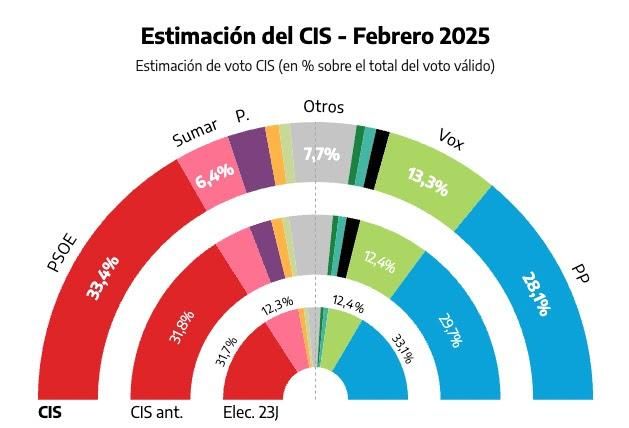 Llega una nueva entrega de la única encuesta en la que el PSOE suele ser primera fuerza. Según el CIS, el PSOE amplía su ventaja sobre el PP. Vox sigue creciendo y Sumar cae.