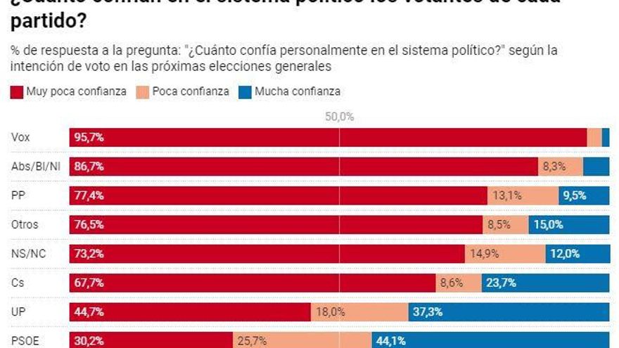 Prácticamente todos los votantes de Vox (el 96%) dicen desconfiar personalmente del sistema político, según la encuesta de elDiario.es. El votante del PP también está más descontento con la política que la media.