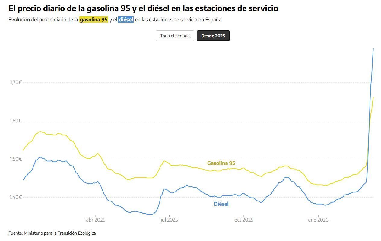 El precio del barril Brent –de referencia en Europa– ha sufrido fluctuaciones estos días. De hecho, tras marcar un récord el lunes, el martes bajó significativamente y este miércoles volvió a repuntar. Lo que no oscila es tu traslado a las gasolineras: siempre al alza. Si has ido a repostar estos últimos días habrás notado un incremento en el ticket. En el caso del gasóleo, el precio ha superado al de la gasolina y alcanza niveles que no se veían desde finales de 2022, tras estallar la guerra de Ucrania. En las gasolineras, el diésel subido un 24% desde el inicio de los bombardeos en Irán. En el gráfico puedes ver cómo evoluciona el promedio del precio del diésel y la gasolina 95 en todas las gasolineras de España, según los datos enviados por más de 12.000 estaciones de servicio al Ministerio para la Transición Ecológica.